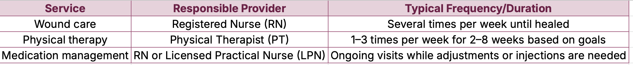 This table clarifies which licensed professionals deliver core home health services and sets expectations for typical visit cadence as part of an outcome-oriented plan.